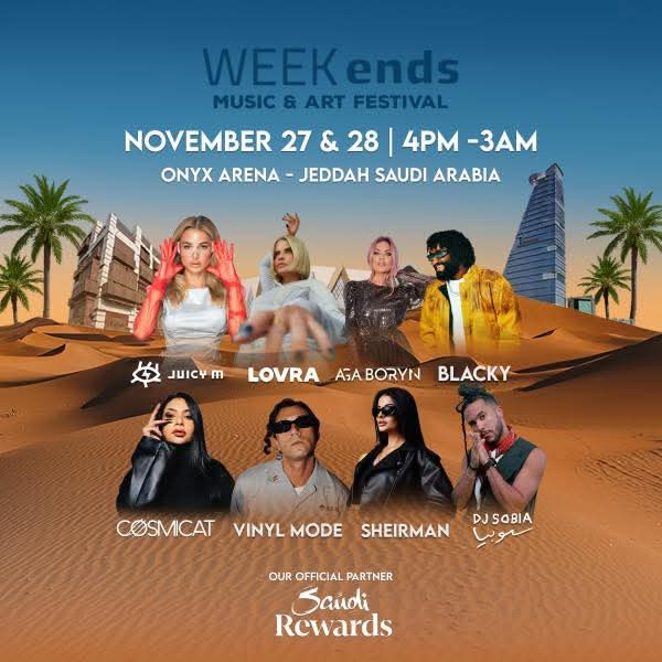 تنطلق يوم الخميس المقبل وبدعم من " روح السعودية " فعاليات مهرجان "ويكندز" للموسيقى والفنون في جدة، بمشاركة 22 فنانًا ونجمًا عالميًا ومحليًا، على مدار يومين متتاليين، 27-28 نوفمبر، في "أونيكس أرينا"