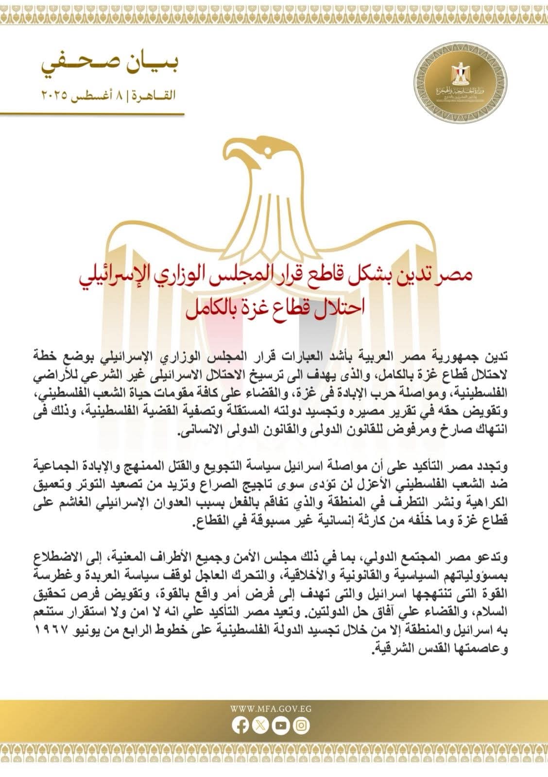 تدين جمهورية مصر العربية بأشد العبارات قرار المجلس الوزاري الإسرائيلي بوضع خطة لاحتلال قطاع غزة بالكامل، والذى يهدف الى ترسيخ الاحتلال الإسرائيلي غير الشرعي للأراضي الفلسطينية، ومواصلة حرب الإبادة فى غزة، والقضاء على كافة مقومات حياة الشعب الفلسطيني، وتقويض حقه في تقرير مصيره وتجسيد دولته المستقلة وتصفية القضية الفلسطينية، وذلك في انتهاك صارخ ومرفوض للقانون الدولى والقانون الدولى الانسانى.