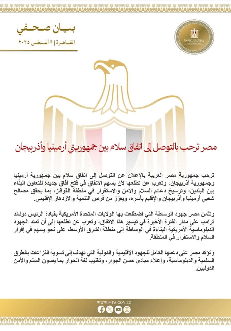 ترحب جمهورية مصر العربية بالإعلان عن التوصل إلى اتفاق سلام بين جمهورية أرمينيا وجمهورية أذربيجان، وتعرب عن تطلعها لأن يسهم الاتفاق في فتح آفاق جديدة للتعاون البنّاء بين البلدين، وترسيخ دعائم السلام والأمن والاستقرار في منطقة القوقاز، بما يحقق مصالح شعبي أرمينيا وأذربيجان والإقليم بأسره، ويعزز من فرص التنمية والازدهار الإقليمي.