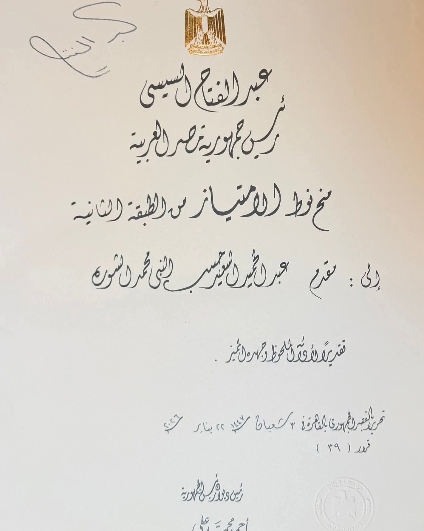 ​في لفتة تقديرية تعكس اهتمام القيادة السياسية بالنماذج المخلصة في جهاز الشرطة، منح فخامة الرئيس عبد الفتاح السيسي، رئيس الجمهورية، "نوط الامتياز" للمقدم دكتور عبد الحميد الشورى، رئيس مباحث قسم أول المنصورة.